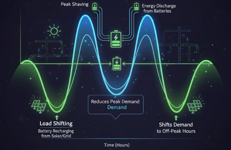 - Batteries can discharge during peaks (peak shaving) and recharge during low-cost, off-peak hours (load shifting).